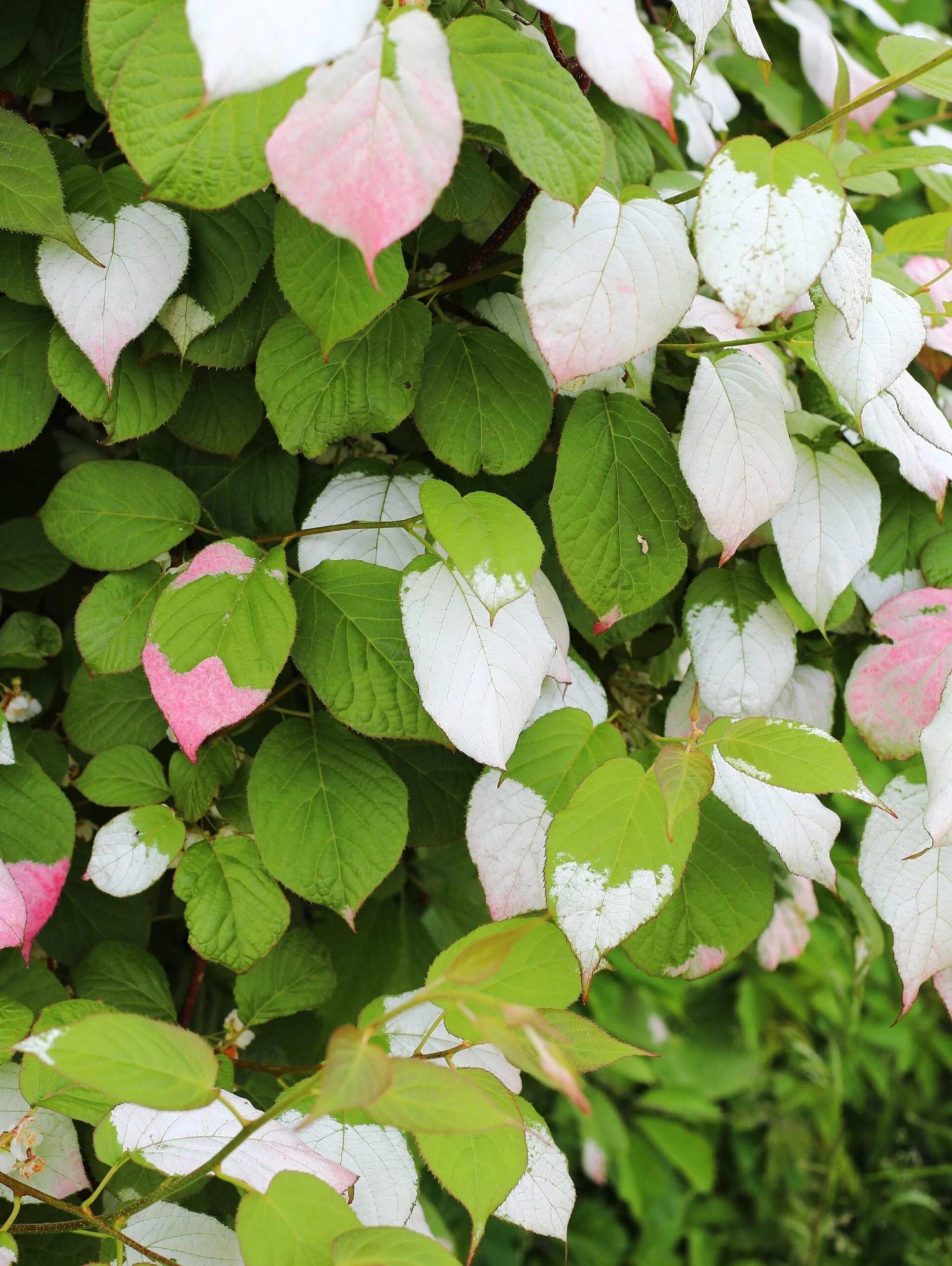 The male Pasha™ vine is noted for its striking ornamental pink, white and green variegated leaves, though the female also has some variegation. It takes a few years before the colors begin so don’t visit the optometrist yet. It rates among the best backyard ornamentals from Vladivostok to Kalamazoo. The male doesn’t produce fruit but pollinizes the productive September Sun kolomikta female.